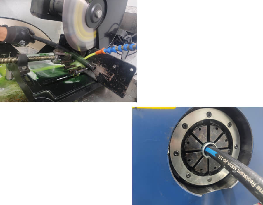 Então fazemos o corte da mangueira e em seguida a prensagem dos terminais, conforme a indicação do fornecedor do conjunto mangueira e terminal.